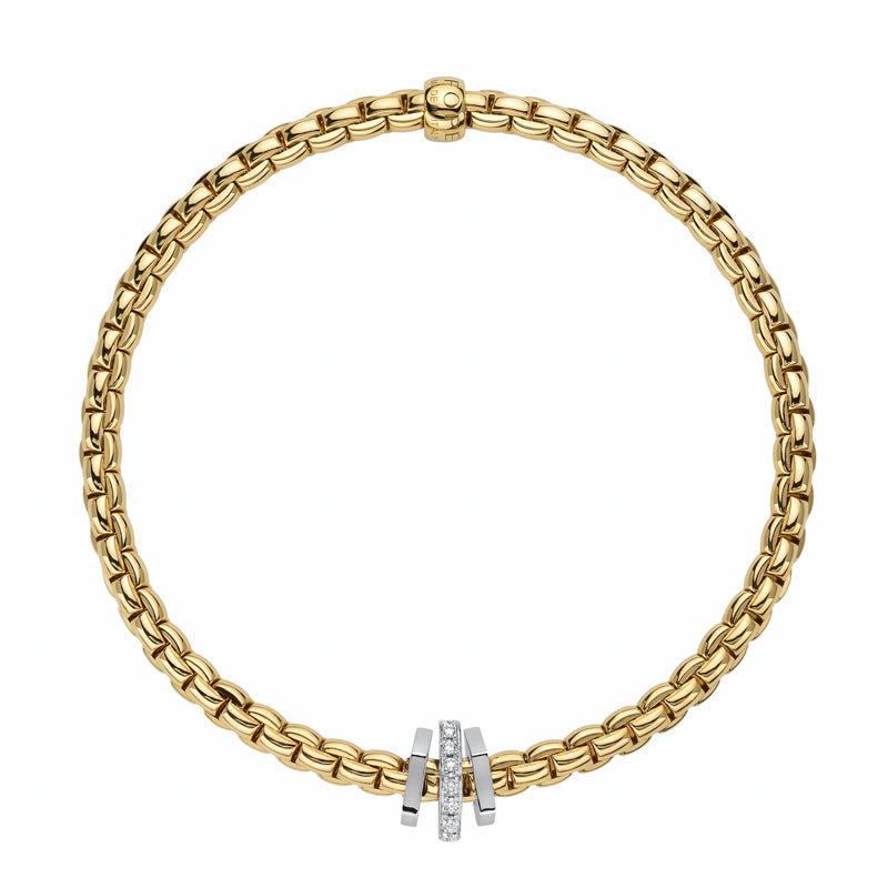 This Fope bracelet comes from the Eka collection and features the renowned Flex'it design. The expertly woven 18ct yellow gold chain features 18ct white gold rondelles, the centre rondelle being embellished with 0.15cts of sparkling brilliant cut diamonds. The bracelet is clasp free for convenience.