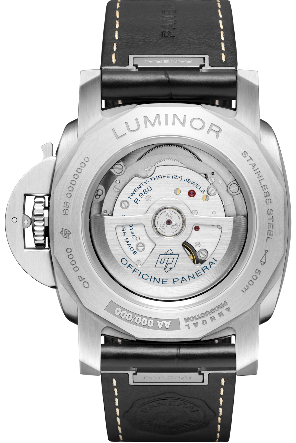 Inside the tough and confident proportions of the Panerai Luminor Marina watch reference PAM03312 is the Calibre P.980, capable of producing three days of power reserve from its single barrel and operating at a frequency of 28,800 vibrations per hour. This Panerai Luminor Marina watch is fitted on a black alligator leather strap with elegant ecru stitching and a brushed titanium trapezoidal buckle, along with a secondary black rubber strap for more casual wear.