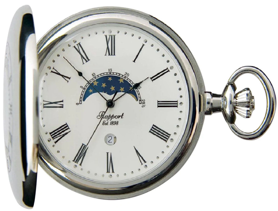 Rapport Pocket Watch Half Hunter PW81. Quartz, Half Hunter Pocket Watch White Roman dial with date window and moonphase display Gold or Silver-tone polished metal case with a plain back.