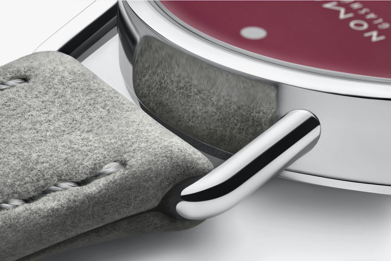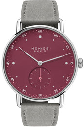 Nomos Glashutte Watch Metro 33 Muted Red 1123.SB. Metro 33 reflects a metropolitan attitude to life. The Alpha movement by NOMOS Glashütte is at work inside offering quality timekeeping with protection of origin for navigating the metropolises of our world. The minute track is the star of this watch. With numerals at five minute intervals. The seconds hand also has this cheerful, gentle tone.
