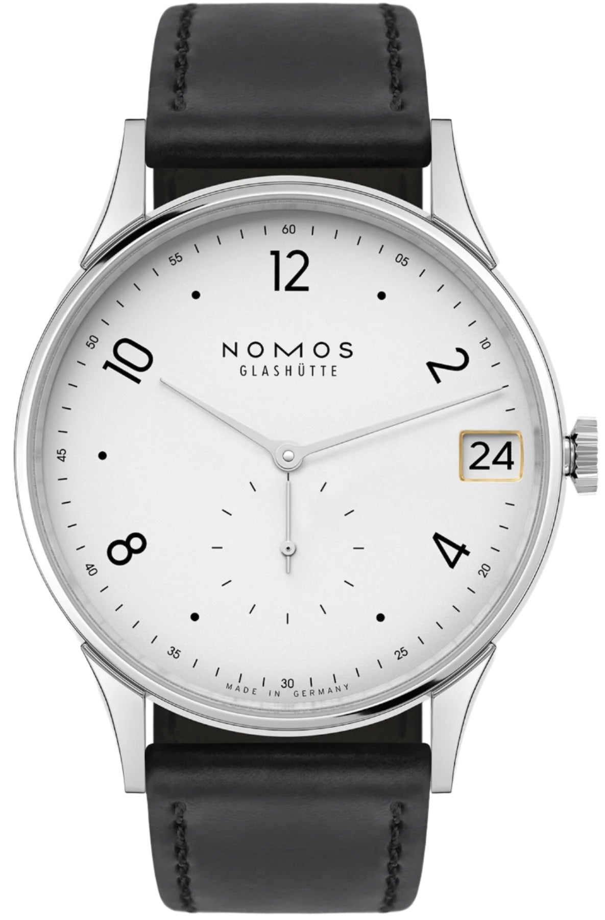 Nomos Glashutte Watch Minimatik 39 Date 1250. This dress watch has both style and substance. From the soft transition of the lugs to the domed sapphire crystal glass over the white silver-plated dial, every detail blends together harmoniously. The date window framed in gold at 3 o'clock celebrates every day and highlights the innovative date caliber at work inside this hand wound watch from NOMOS Glashutte. Golden days for a lifetime.