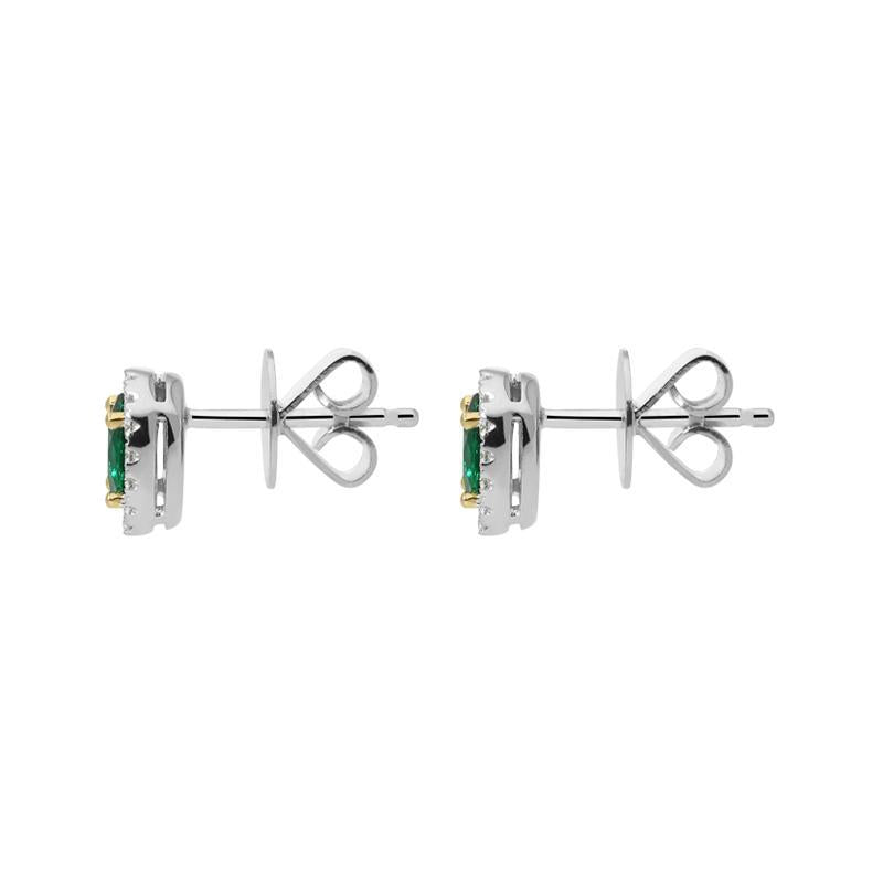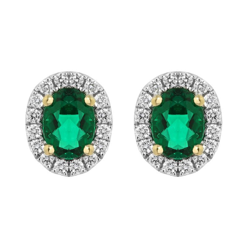 Elegant and stylish, these 18ct white gold earrings feature stunning oval cut emerald gemstones, totalling 0.26cts. The precious gemstones are claw set within 18ct yellow gold, allowing the maximum amount of light to travel through the stones and creating a beautiful contrast between the two metals. The emeralds are encompassed within sparkling halos of brilliant cut diamonds, totalling 0.16cts. Designed perfectly for everyday wear, these gemstone set studs are completed by secure post and butterfly fastenings.