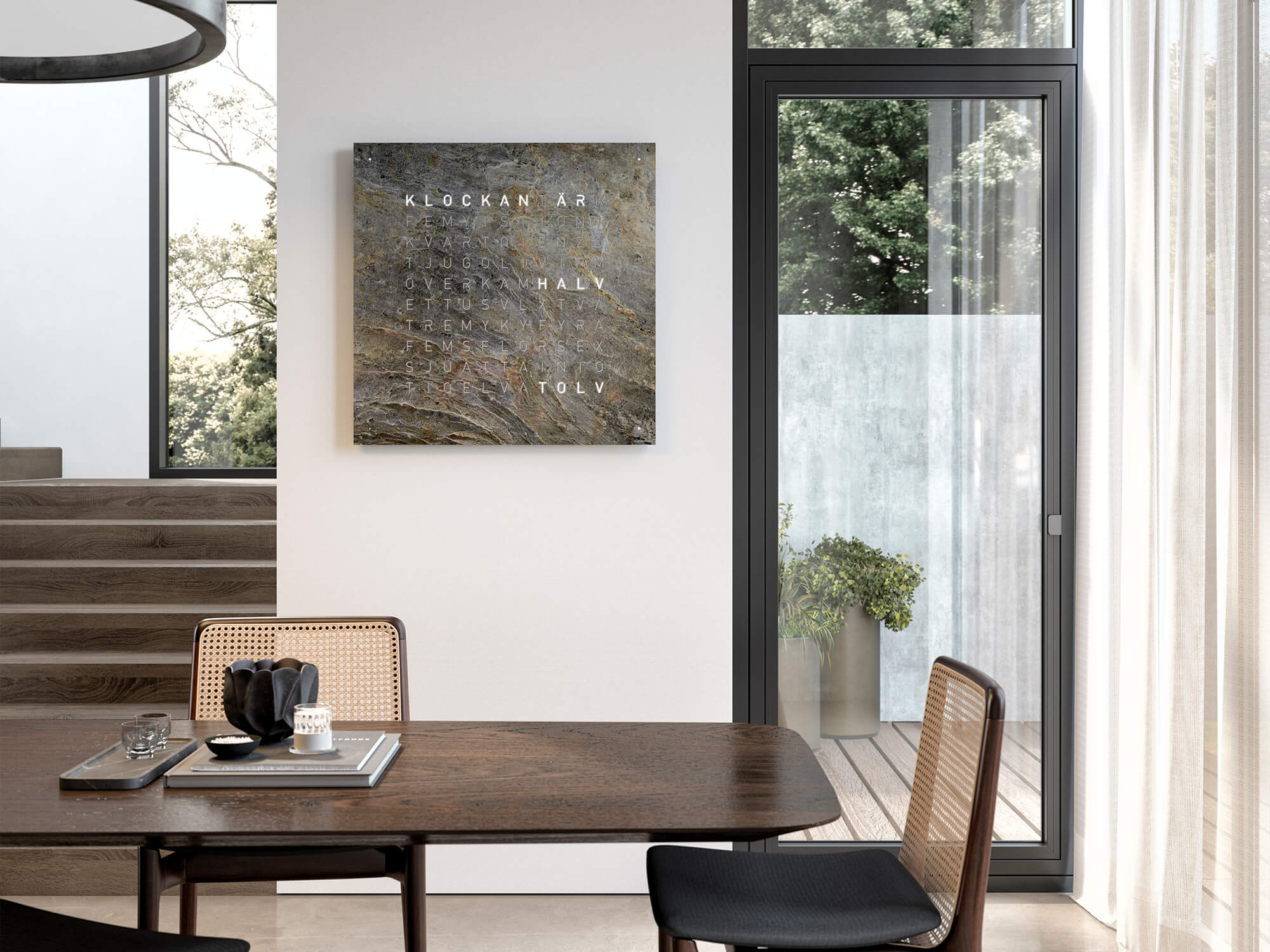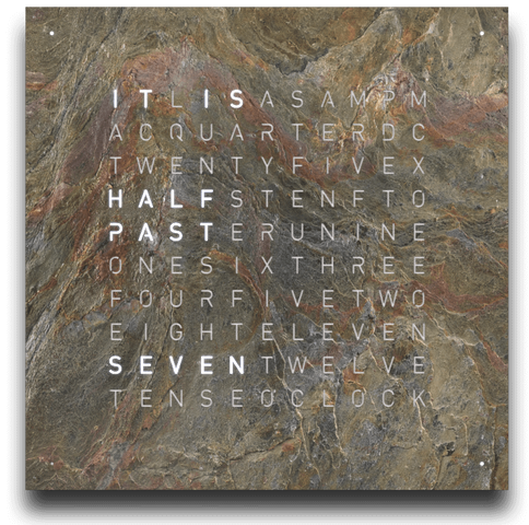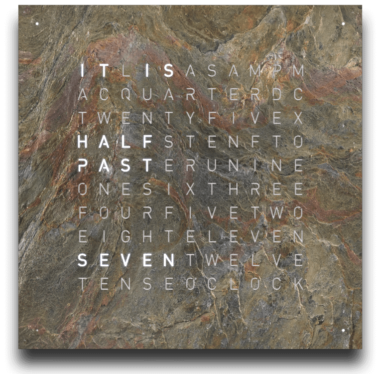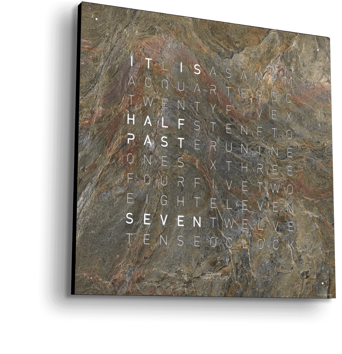 • METAMORPHITE -The front cover of the QLOCKTWO EARTH 90 CREATOR’S EDITION fascinates with millions of years old slate. The unique, typical structure of the sedimentary rock creates an interesting interplay of colours with shades of grey. Delivered on a white clock body.