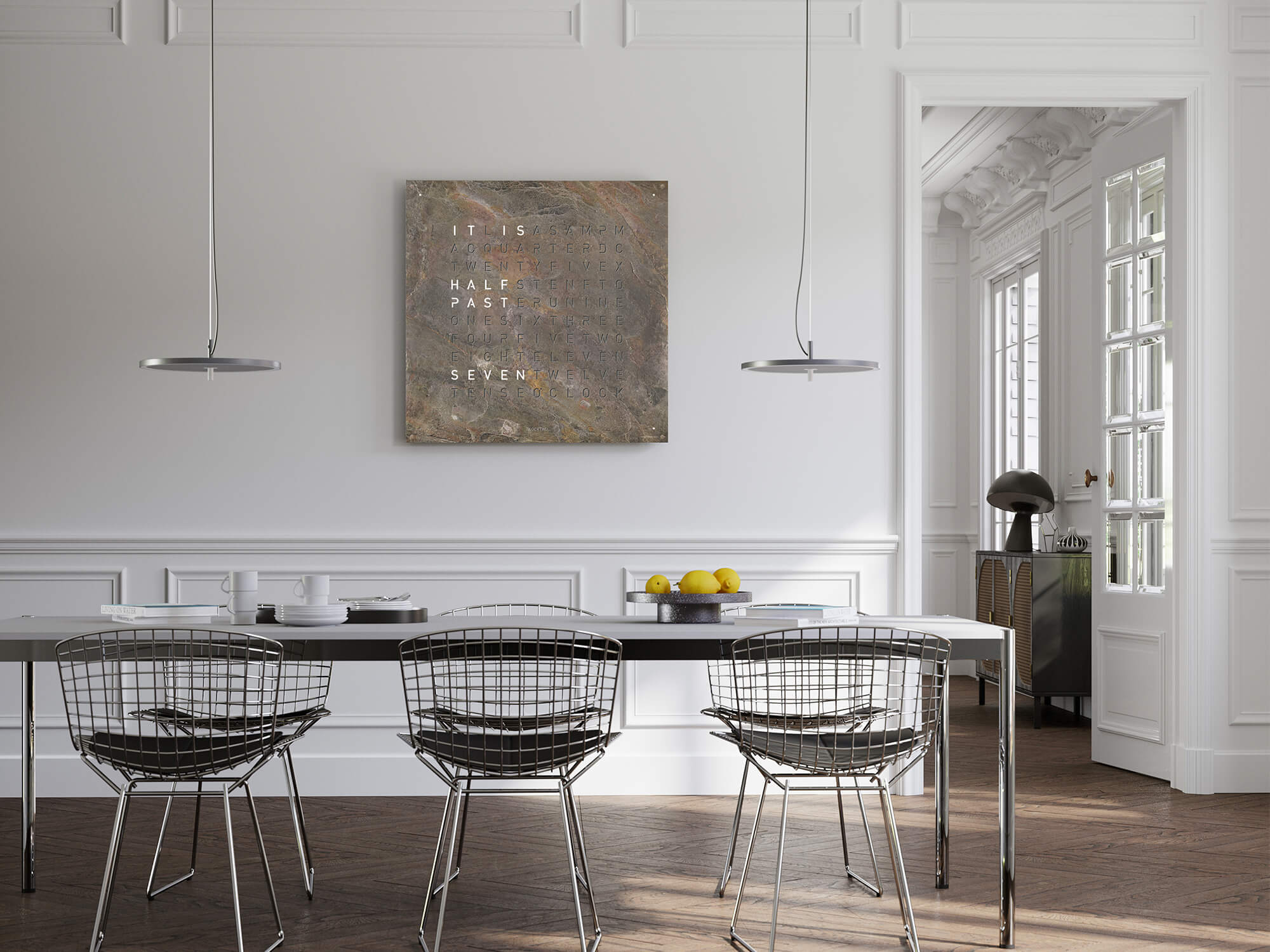 The typographic font combines the moment with the written word and makes a statement: “IT IS QUARTER PAST SEVEN. The words change in five minute increments, with four small, illuminated corner points displaying the minutes in between. QLOCKTWO EARTH appears to float elegantly when wall mounted and if the power connection is visible a coloured textile cable can be added for an additional design element.