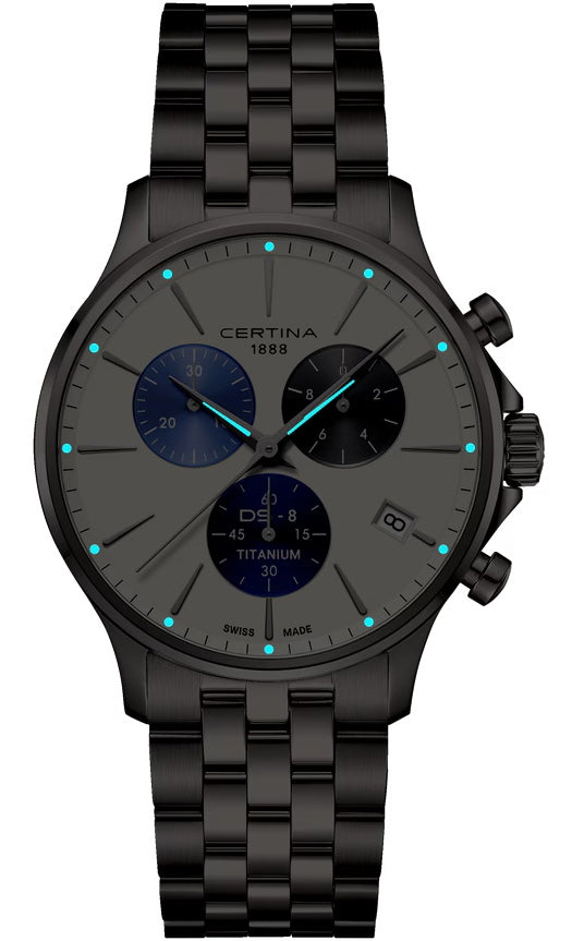 Certina Watch DS-8 Chrono Titanium C045.417.44.011.00. The DS-8 collection combines technical performance with a genuine sense of style, whether an elegant automatic timepiece for him and her, a women's quartz model with chronometer certificate or a chronograph featuring the captivating spectacle of a moon phase display.