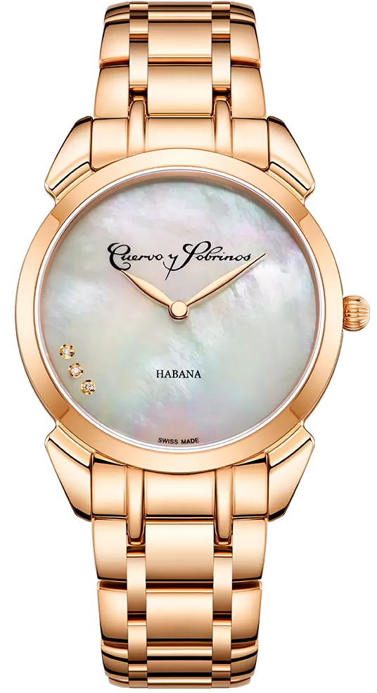 Cuervo y Sobrinos Watch Historiador Primera Dama Gold PVD White Bracelet 3113B.7W. The Cuervo y Sobrinos Historiador Primera Dama is inspired by the Golden years of Havana. The “Pearl of the Caribbean, at the end of the 19th century, was a privileged center of luxury and the beautiful world: a universe of glamour, luxury, music and dancing that attracted people for all continents. Feminine and elegant, inspired by the Art deco movement of the those years, this ladies' watch, which features numerous appealing details, is suitable for any occasion.