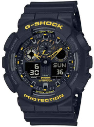 G-Shock Watch Black Caution Yellow Mens GA-100CY-1AER. Turn heads and grab attention with a rugged timepiece boasting a bold, eye-catching black and yellow color scheme. Tough, yet stylish designs feature basic black, accented with touches of the bright yellow used for emergency rescues and safety signs. A cool, versatile look that complements both casual and work styles.