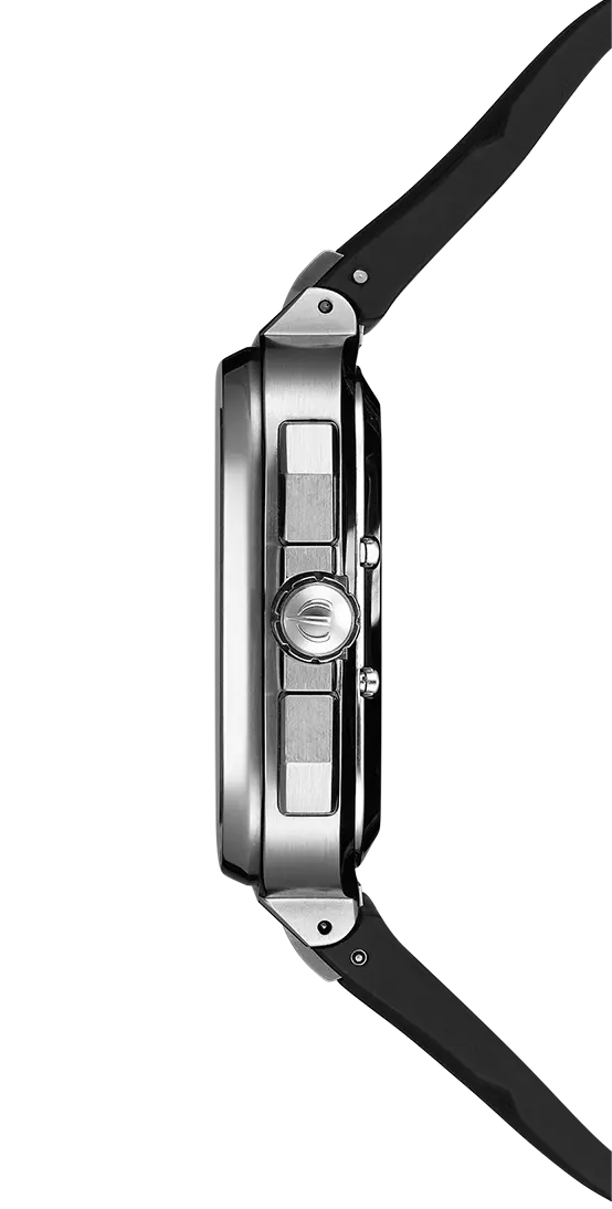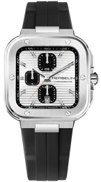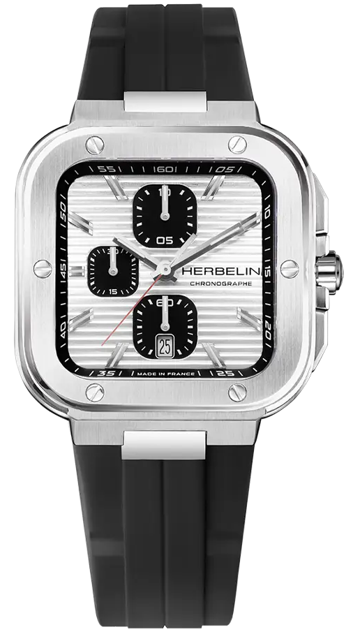 Herbelin Watch Cap Camarat Square Chronograph 35646A42CA. The CAP CAMARAT Square Chronographe Acier is a men's model that combines sporty elegance and watchmaking performance. Featuring a stainless steel case, this men's watch boasts a neo-vintage design, whose robustness is underscored by polished facets and a bezel adorned with 6 decorative screws, placed in the extension of the indexes. The notched crown stands out, while the almost invisible push-buttons harmonize with the shape of the case. The horizontally-stamped White Silver dial features three black C-shaped counters and a date window at 6 o'clock. These indicate small seconds, 1/10th of a second and 30 minutes, thus offering all chronograph functions. The contrast between the counters and the silver dial creates a strong contrast, for optimal legibility. The fine red seconds hand adds a touch of color and elegance to the overall look. The black FKM elastomer strap guarantees exceptional comfort and durability. This bracelet, guaranteed for 10 years, is harmoniously integrated into the case, reinforcing the sporty-chic character of this timepiece. Featuring a sapphire crystal and water-resistant to 100 meters, the CAP CAMARAT Square Chronographe Acier is equipped with a SW200-1 - 11 ½''' quartz movement, ensuring flawless precision. This neo-vintage model, with its urban allure and meticulous detailing, is aimed at lovers of fine mechanics who appreciate a watch that is functional, masculine and sporty.