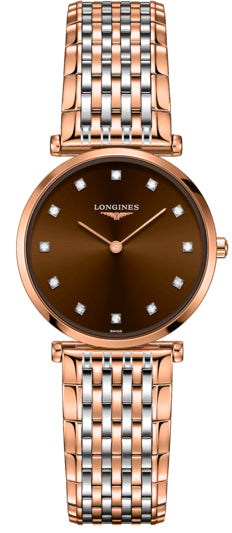 Crafted from elegantly polished rose gold PVD stainless steel, the 29mm case of this Longines La Grande Classique de Longines Mens watch is home to a Swiss made quartz movement. The 420 calibre maintains almost perfect precision and provides classic central hands for hours and minutes. The movement is kept hidden behind a 30 metre water resistant case back and beneath a stunning sunray brown dial decorated with sleek rose gold hands and 12 Top Wesselton diamond dot indices. Protected by scratch resistant sapphire crystal glass, the brown dial and famous hourglass logo pair perfectly with the fine link two toned steel and rose gold bracelet and triple safety folding buckle with push piece opening mechanism.