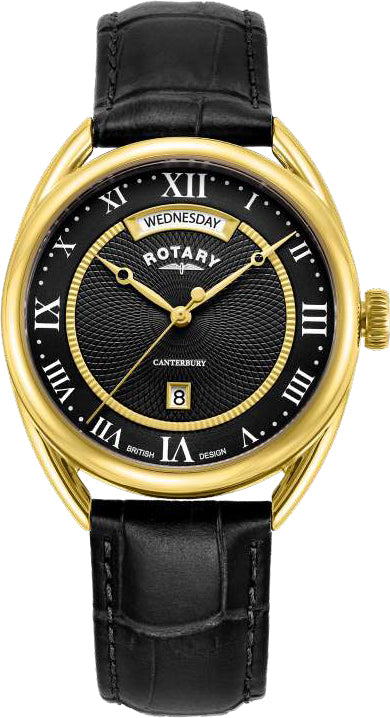 Rotary Watch Canterbury Mens GS05533/10. The Canterbury daydate looks to a bring a new Era of ultra classic Rotary designs that Rotary are known for. The design takes design cues from the popular Sherlock Watch and pushes these details. The new guilloche spiral texture elevates the dial while encased in a fluid wired lug case design that flows onto the wrist.