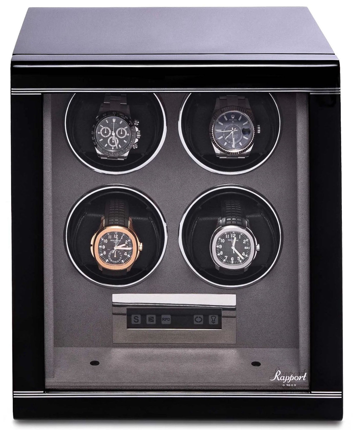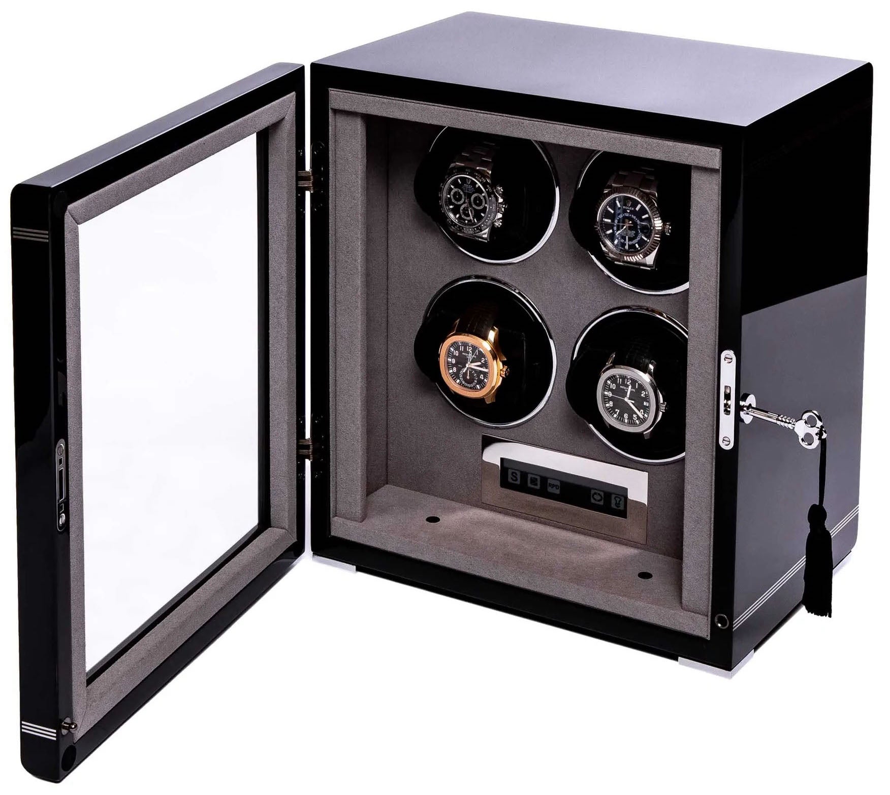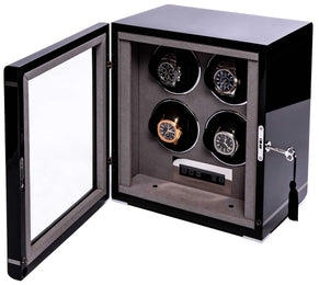 Rapport Watch Winder Formula 4 Black W554. Rapport London consider ourselves experts in the world of watch winders, which is why we can confidently say the Formula Watch Winder is the best place to store your timepieces. The Formula features a lockable front, glass door with three distinct stripes across the front, which distinguish this range. This sleek piano black or carbon fibre watch winder stores up to four automatic watches, each with their own setting which can be controlled through an LCD control panel.