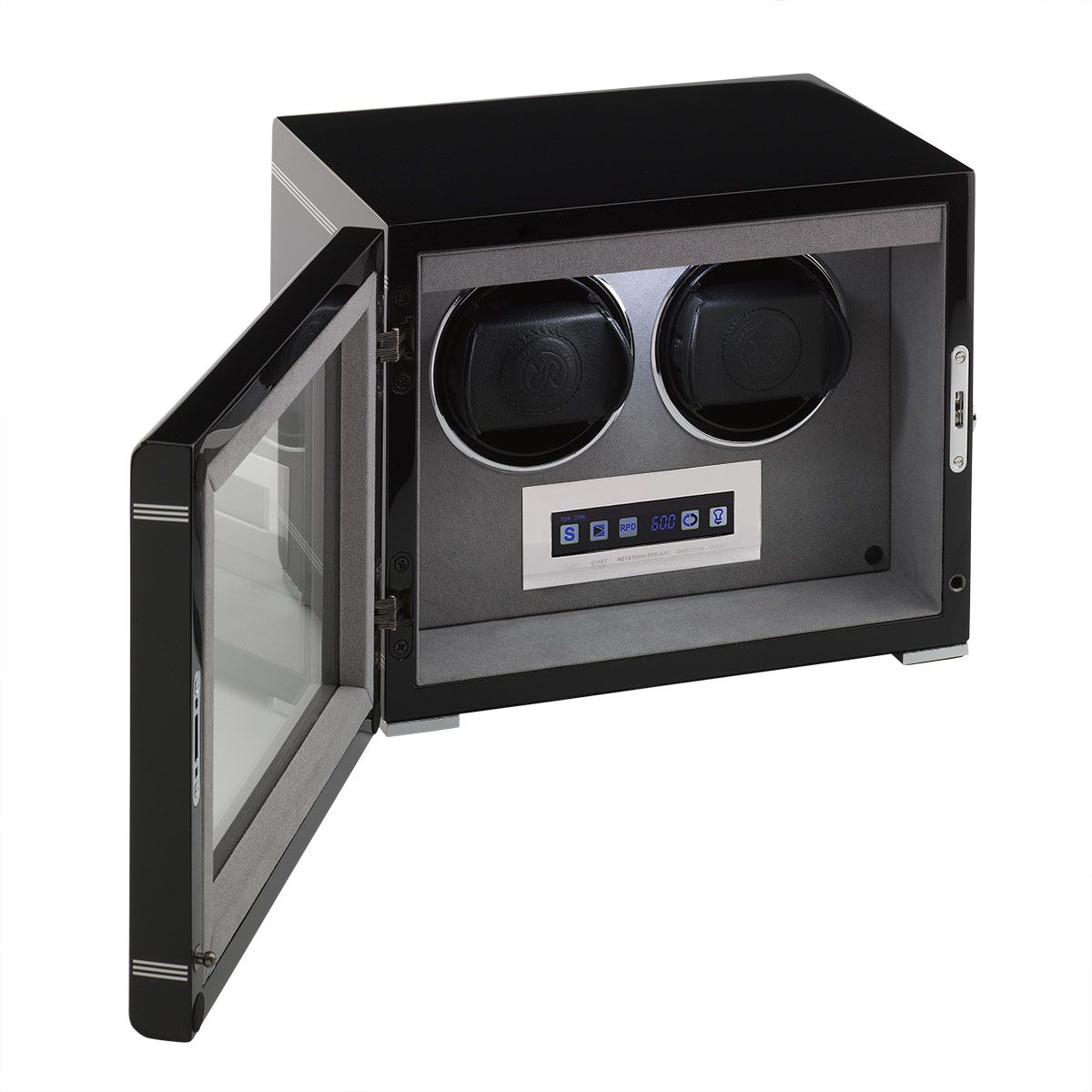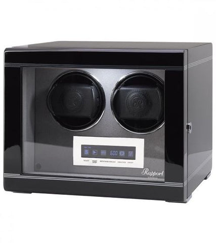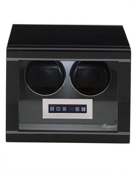 Rapport Watch Winder Formula Double Black W552. Classically elegant duo watch winder. 21st Century redesign. Touch Screen LCD display. Interior lighting. Soft feel velvet lined interiors. Chrome fittings. Hand applied lacquer for a Black piano finish.