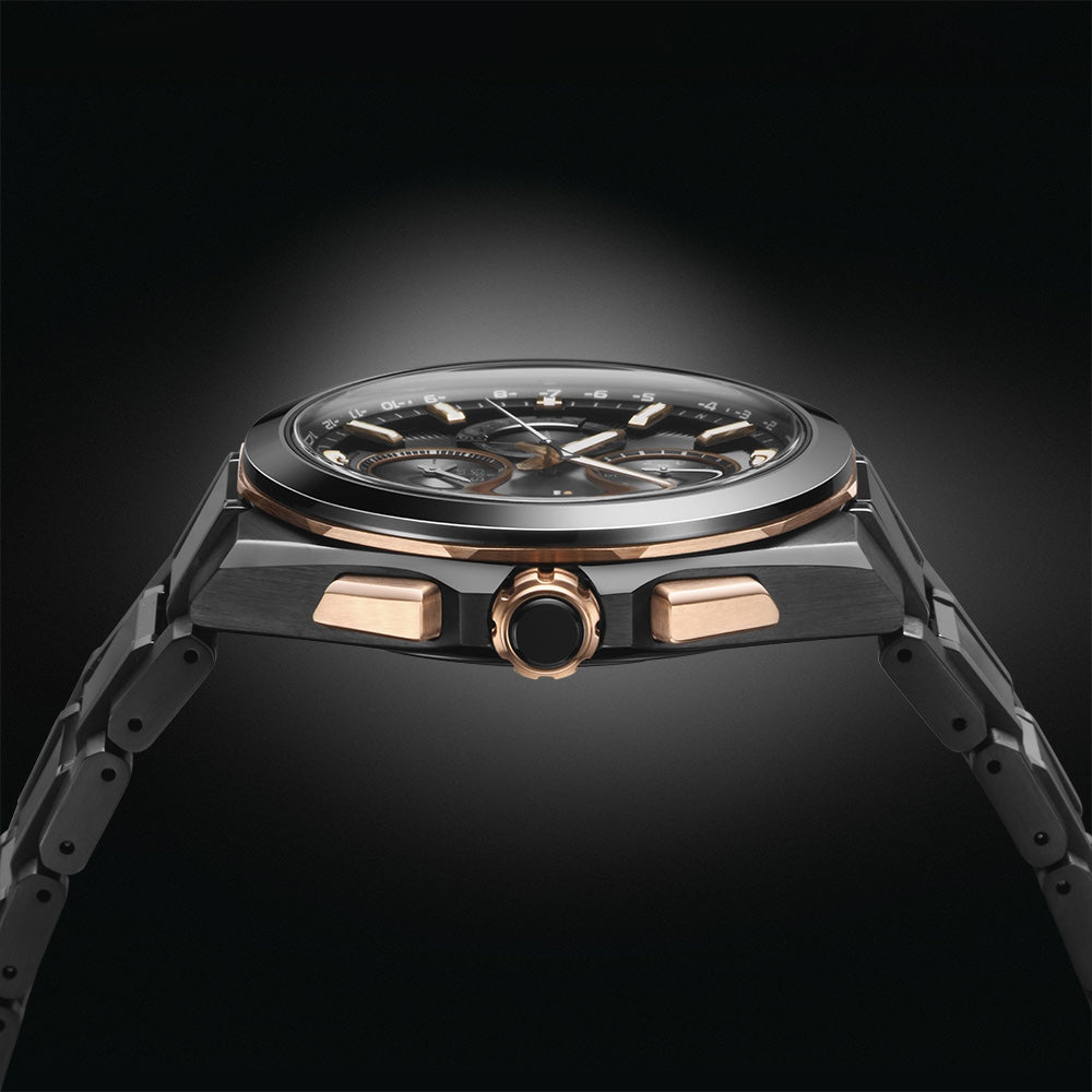 Under a dual-curved sapphire crystal glass, within a compact and slim bezel design, is a radiating patterned black dial. The bezel is crafted from titanium and rose-gold colour plated ceramic. The increased charging capacity of this calibre allows for a textured dial whilst still maintaining high charging efficiency. The titanium case construction has a super hard coating for increased scratch resistance. The case is a compact and angular design that flows seamlessly from the bezel, through the lugs and to its titanium and ceramic bracelet. With sleek lines, this watch has a slim profile.