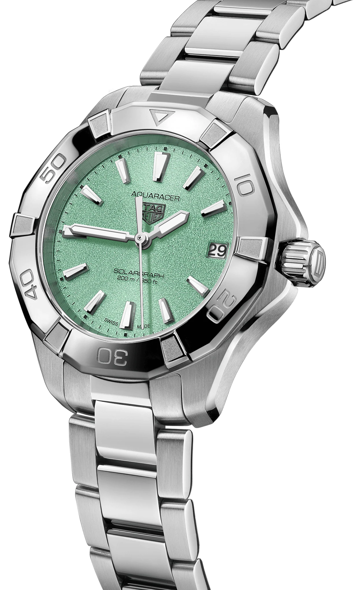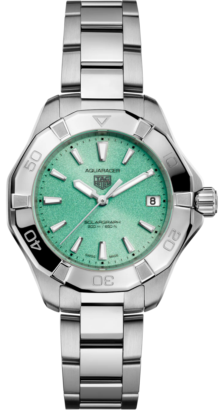 TAG Heuer Aquaracer Professional 200 Solargraph 34 WBP1315.BA0005. Experience the eternal beauty of the northern lights with this polar blue-themed TAG Heuer Aquaracer, equipped with our Solargraph movement. Crafted for the modern adventurer, this 34 mm timepiece is a versatile tool that effortlessly transitions from the wilderness to the cityscape.