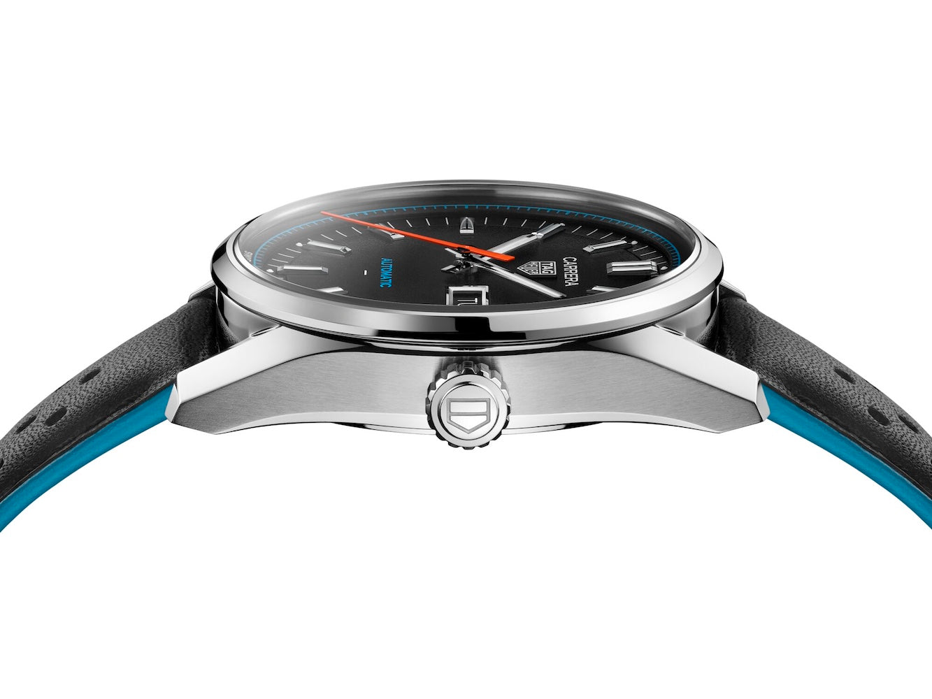 The TAG Heuer Carrera Day Date watch reference WDA2110.FC6614 is powered by the TH31 02 manufacture movement, which provides a power reserve of 80 hours once fully wound. It sits behind a sapphire crystal exhibition caseback. The dynamic red and blue lacquered elements are the focal feature of this classic design, underscoring its rich, dynamic and sporty personality. The watch is completed on a black perforated leather strap inspired by the leather of a racing wheel and encloses against the wrist with a stainless steel folding clasp.