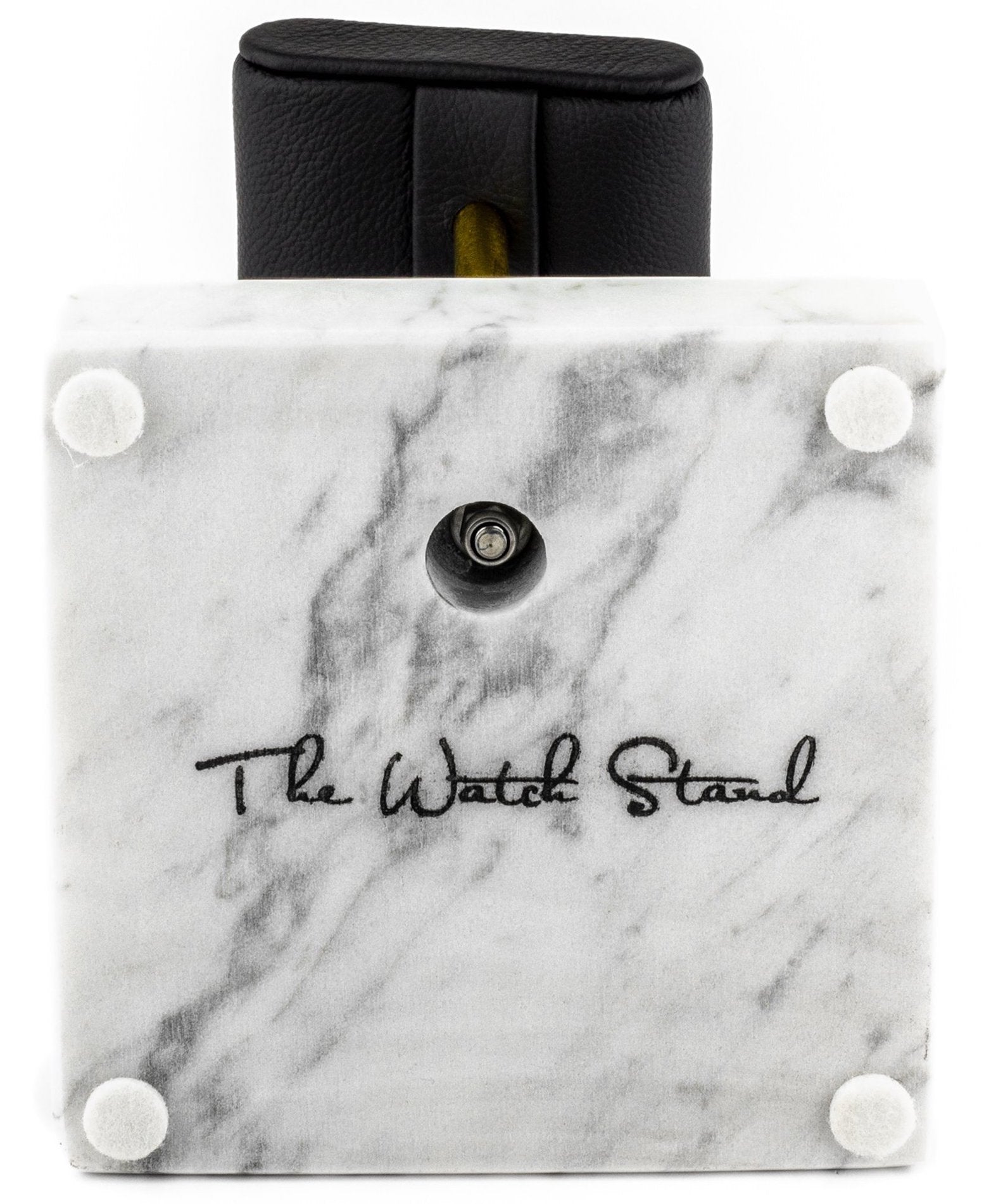 The Watch Stand is handcrafted in Europe with the finest leather and marble from Italy. Our logo is engraved on the bottom side of the stone.