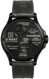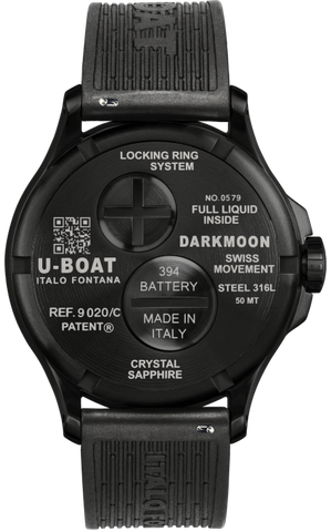 U-Boat Watch Darkmoon Blue PVD Soleil 9020/C. For those who considered 44mm a size too relevant, U-BOAT today launches a selection of two Darkmoon watches with a 41.5mm case, available in both shiny steel and black with DLC treatment. Under the domed sapphire crystal, two dials in black and blue painted brushed metal with soleil finish, both with hands, indexes and numbers treated with beige superluminova. Could not be missed the innovative Oil Immersion concept with a special oil that fills the entire case that with the compensation bubble, free to float on the dial, emphasises its three-dimensionality, as in the absence of glass, its legibility and colour intensity. On the back, the innovative Locking Ring System with quick battery replacement ensures water resistance to a depth of 50 m. Darkmoon 41.5mm, a new perception of time directly on your wrist.