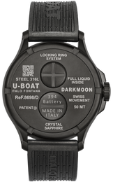 U-Boat Darkmoon 46.5mm Green PVD Watch 8698/E. A collection inspired by the dark side of the moon. The U-Boat watches Darkmoon goes beyond the boundaries of traditional design, combining innovative features with retro style lines. The Swiss electromechanical movement is completely immersed in a low viscosity lubricating oil. The oily liquid flows into the dial making it an absolute and deep black and creates an ever moving compensation bubble that surprisingly amplifies view of the hands that seem to flow free as in the absence of the glass. Different shades of dial with Soleil finish. Oil Immersion concept. Innovative system of battery replacement and of Oil Refill.
