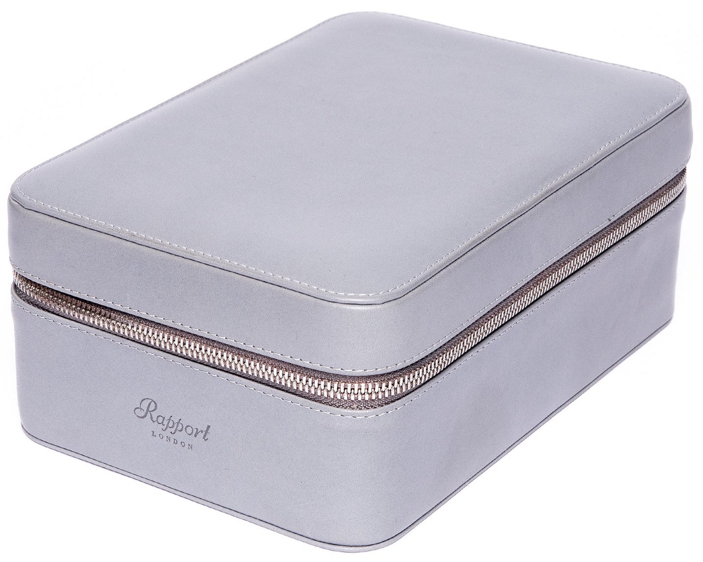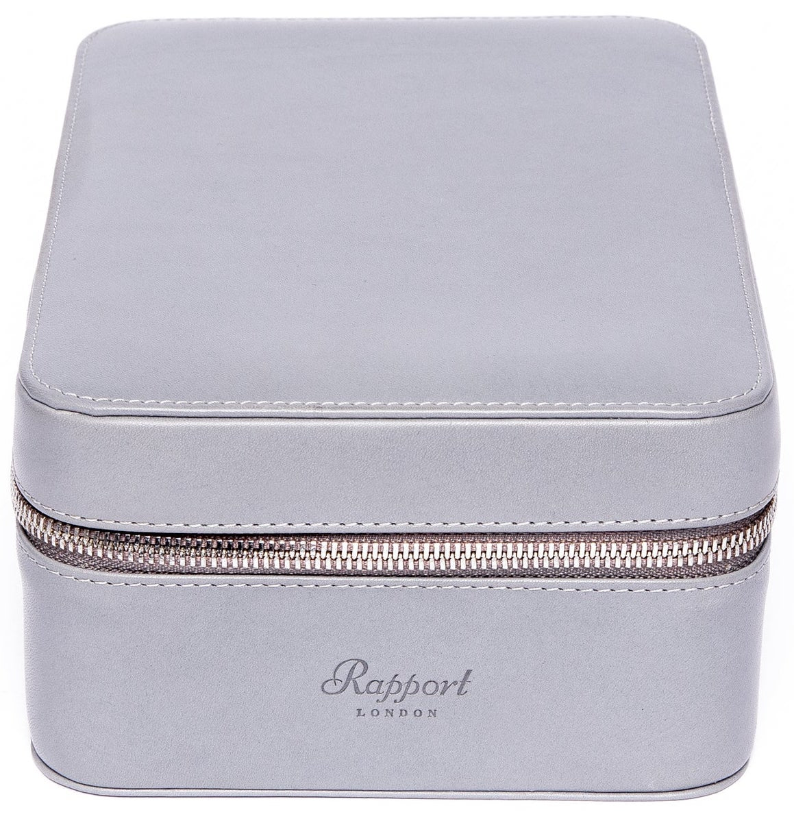 Rapport Watch Case Hyde Park 4 Grey Zip D274. The Hyde Park zip case is an elegant way to store Rapport precious watches. The highest quality leather covers the case in a creamy black, grey, tan or navy colRapport, accompanied by a robust zip to close. A luxurious suede lines the inside with fRapport watch compartments, each with an adjustable watch cushion.