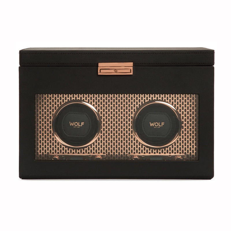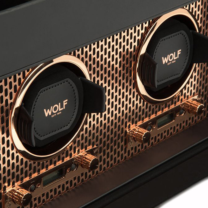 WOLF Watch Winder Axis Double Copper 469316. Powder-coated and copper plated laser cut perforated steel melded with clean, sleek lines. AXIS drives a modern, bold look for safekeeping your timepieces. Features custom metal plating, micro suede interior, locking glass cover, backlit LCD display, powder coated or copper finished hardware, 1 watch storage with elevated cuff, 2 medium compartments, travel case and 2 winding modules.