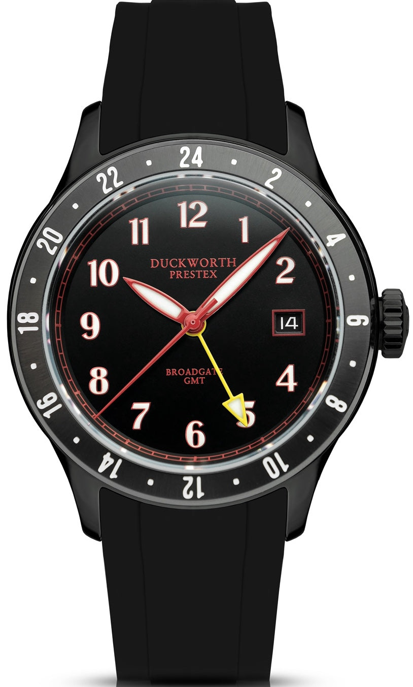 Duckworth Prestex Broadgate GMT Black Black Rubber Watch D760-01-AR. The Broadgate 40mm round case automatic GMT. Taking its name the from the world famous financial centre in the heart of the city of London . This is an urban timepiece par excellence.