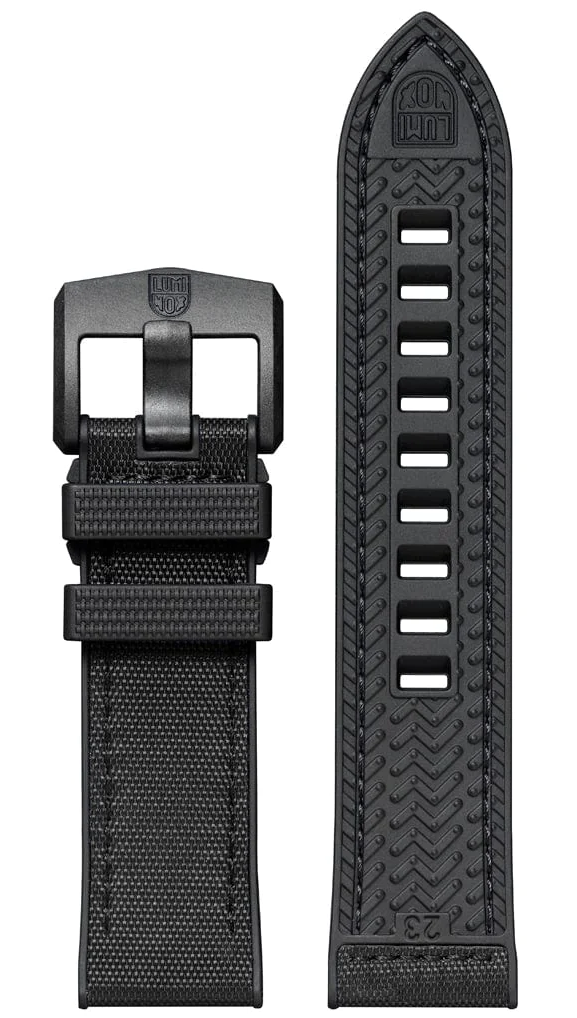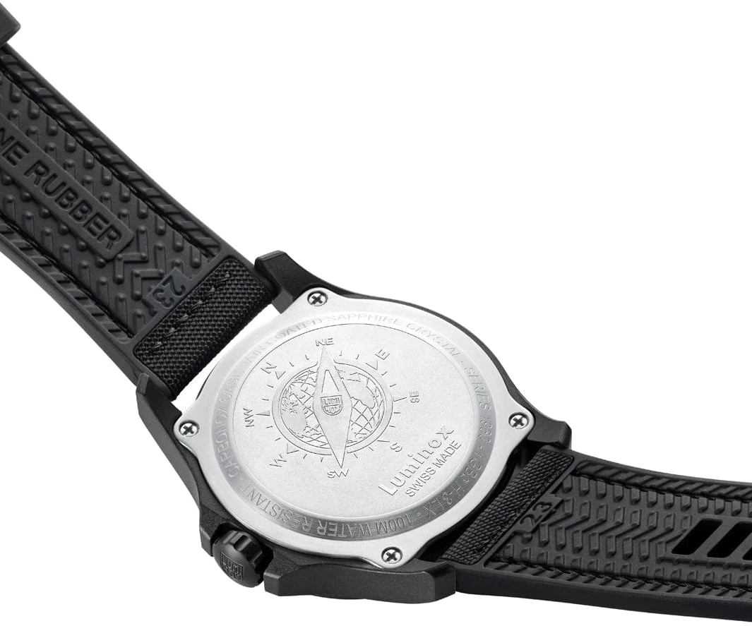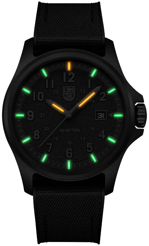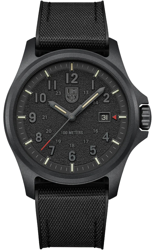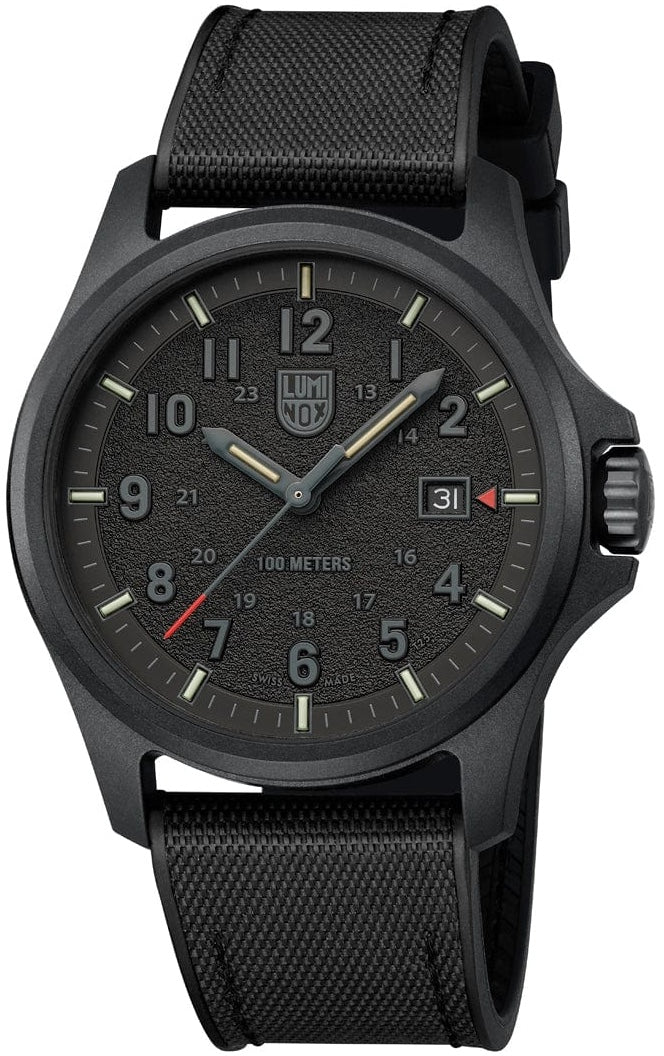 Luminox Watch Atacama Field 43mm Urban Adventure XL.1961. This Atacama Field 1961 watch is inspired by its namesake, the Atacama Desert. The full blackout design with textured finish dials evokes the terrain and rugged landscape of the desert. The timepiece presents a large dial that displays the 12- & 24-hour clock, along with a red tipped second hand and red arrow next to the date at 3 o’clock for instant readability. The dial is protected by sapphire crystal with anti-reflective coating. The 43 mm CARBONOX™ case is matched with a black rubber strap.
