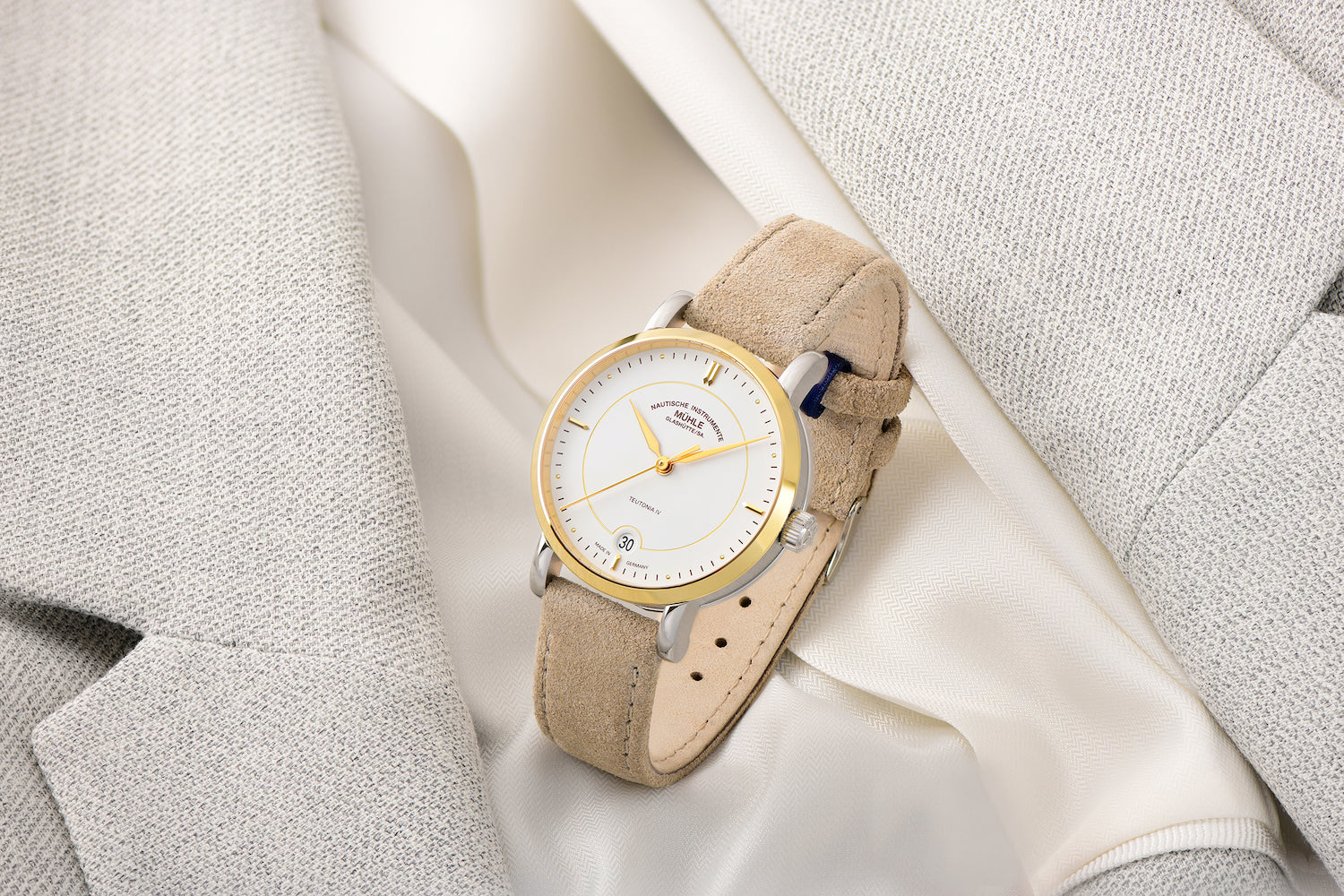 Muhle Glashutte Watch Teutonia IV Lady M1-44-51-LB-V-VII. Granted, beauty is always in the eye of the beholder. But even viewed objectively, the new Teutonia IV Lady is impressive with its elegant two-tone case: Because we use 18-carat yellow gold for the bezel of the elegant ladies' watch. This makes the new model not only a valuable piece of jewelry, but also a timeless beauty.