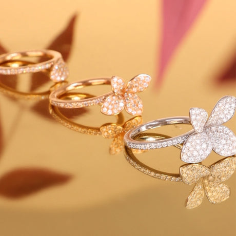 Ton Joli maintains the delicate faceting of the taglio Bon Ton, an exclusive Pasquale Bruni patented cut. The collection reinterprets the five-petals iconic flower of the Maison in new sophisticated proportions. Gems blend into a rose gold flower, wrapped in a leaf of white and champagne diamonds.