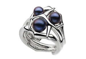 Blackthorn reveals personal passions and themes - woodlands and wildflower hedgerows. Thorny sterling silver stems nestle scattered leaves of dewy black spinel and the lustre of dark pearls form dynamic hoops of moonlit flora.