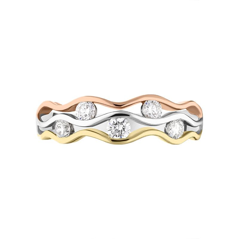 This striking ring features 18ct yellow, rose and white gold. The ring is embellished with a five sparkling brilliant cut diamonds (0.34ct) which have been tension set to create this unique wave design. Designed perfectly for everyday wear, this diamond set piece would make the perfect dress or eternity ring.