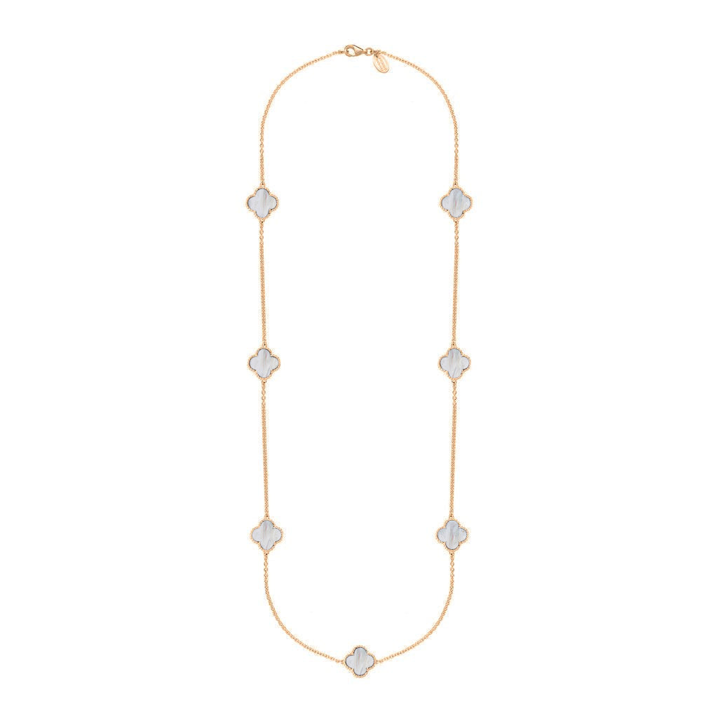 18ct Rose Gold White Mother of Pearl Bloom Four Leaf Clover Ball Edge Long Necklace