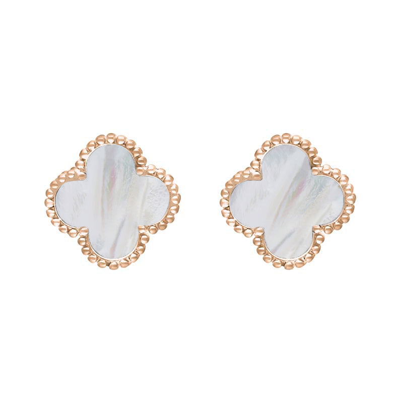 18ct Rose Gold White Mother of Pearl Bloom Four Leaf Clover Ball Edge Stud Earrings - E2600 (BLM-397)