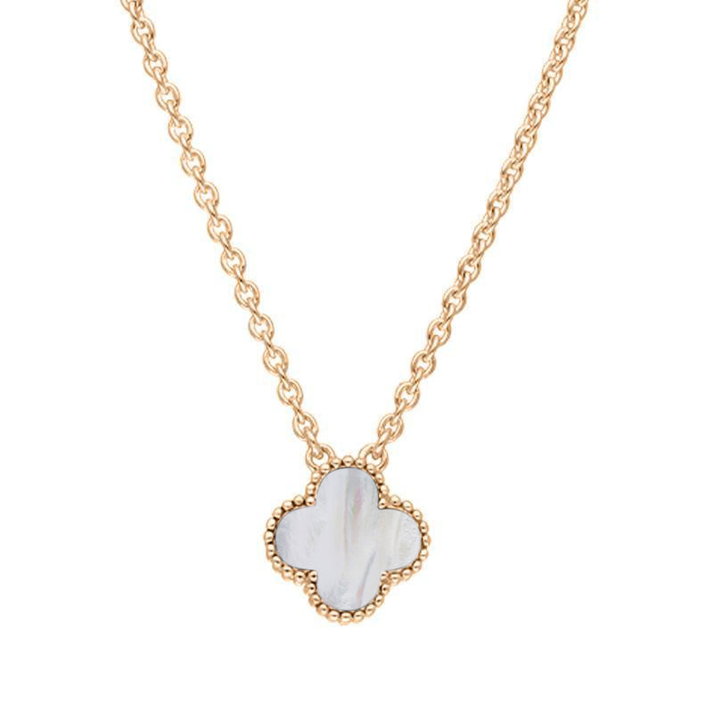 This elegant necklace features a stunning four leaf clover shaped cabochon of the finest Mother of Pearl. The clover is surrounded by a ball edge detail for a unique, stylish finish. The striking Mother of Pearl forms a stunning combination with the 18ct rose gold ball frame, creating the perfect look for every occasion. Presented on an 18 inch long chain.