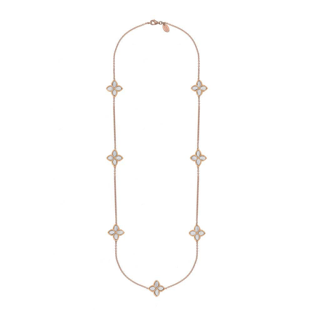 This elegant necklace features seven stunning marquise shaped cabochons of the finest Mother of Pearl. The flower is surrounded with a rope edge detail for a unique, stylish finish. The striking Mother of Pearl forms a stunning combination with the 18ct rose gold rope edge frame as the flowers hang gracefully along a 77cm chain, the perfect look for every occasion.