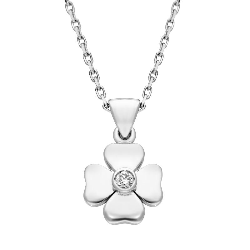This feminine 18ct white gold necklace features a cross shaped pendant, with each line of the cross resembling a heart. Adorned in the centre of the cross, 0.10ct sparkling brilliant cut diamonds. The pendant is completed with a secure 18ct white gold chain.