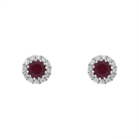 These classic 18ct white gold stud earrings feature a beautiful round cut ruby in each centre (0.28ct total), framed by a cluster of sparkling round brilliant cut diamonds (0.10ct total). The earrings are completed with secure post and butterfly fastenings.