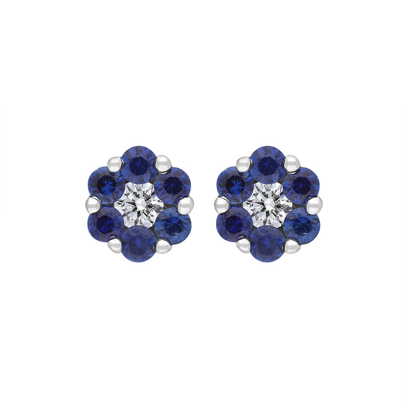 These classic 18ct white gold stud earrings feature a brilliant cut claw set diamond in each centre, totalling 0.13cts for the pair. The sparkling diamond is framed by a cluster of vibrant round cut sapphires, totalling 0.46cts, to create this feminine floral design. These earrings are completed with secure 18ct white gold post and butterfly fastenings, for easy everyday wear.
