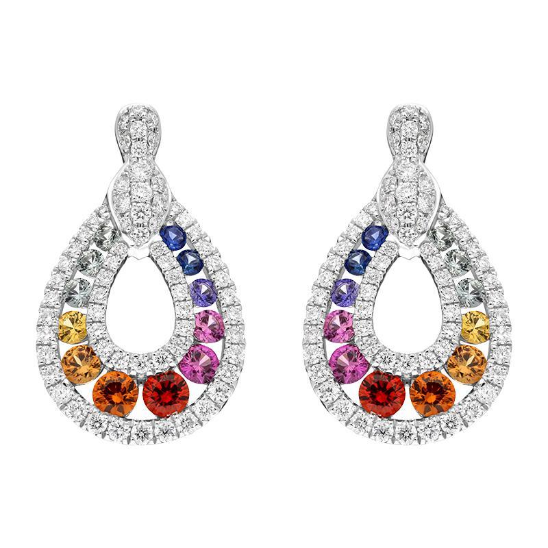 An embodiment of femininity, these stunning 18ct white gold drop earrings feature a contemporary open pear shaped design, beautifully embellished with 0.52cts of colourful sapphire stones and framed by 0.81cts of sparkling brilliant cut diamonds. The stud of the earring is further embellished with sparkling white diamonds. Designed perfectly to add a touch of colour and elegance, these diamond and precious gemstone set earrings are secured with classic post and butterfly fastenings.