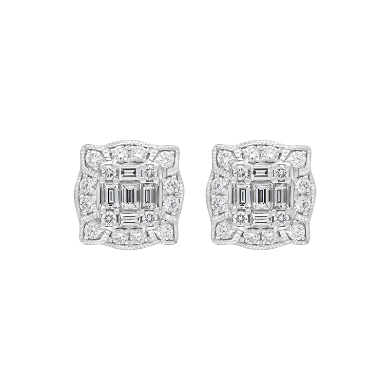 Feminine 18ct white gold stud earrings featuring a sparkling arrangement of baguette and brilliant cut diamonds (0.27ct, 0.31ct, Diamond total 0.58ct). Designed perfectly for everyday wear, the earrings are completed with post and butterfly fasteners.