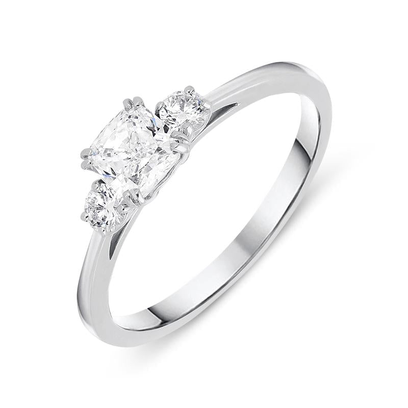The central GIA certified cushion cut 0.55ct diamond is of stunning F colour and VS2 clarity. It is flanked by two round brilliant cut diamonds which give this piece a truly showstopping display of dazzling light and colour. The total diamond carat weight in this piece is 0.71cts. The three diamonds are claw set, allowing the maximum amount of light to enter the stones, to give the best sparkle possible. The 18ct white gold band gives this beautiful ring a solid and substantial weight, making this a piece that will be treasured for generations to come.