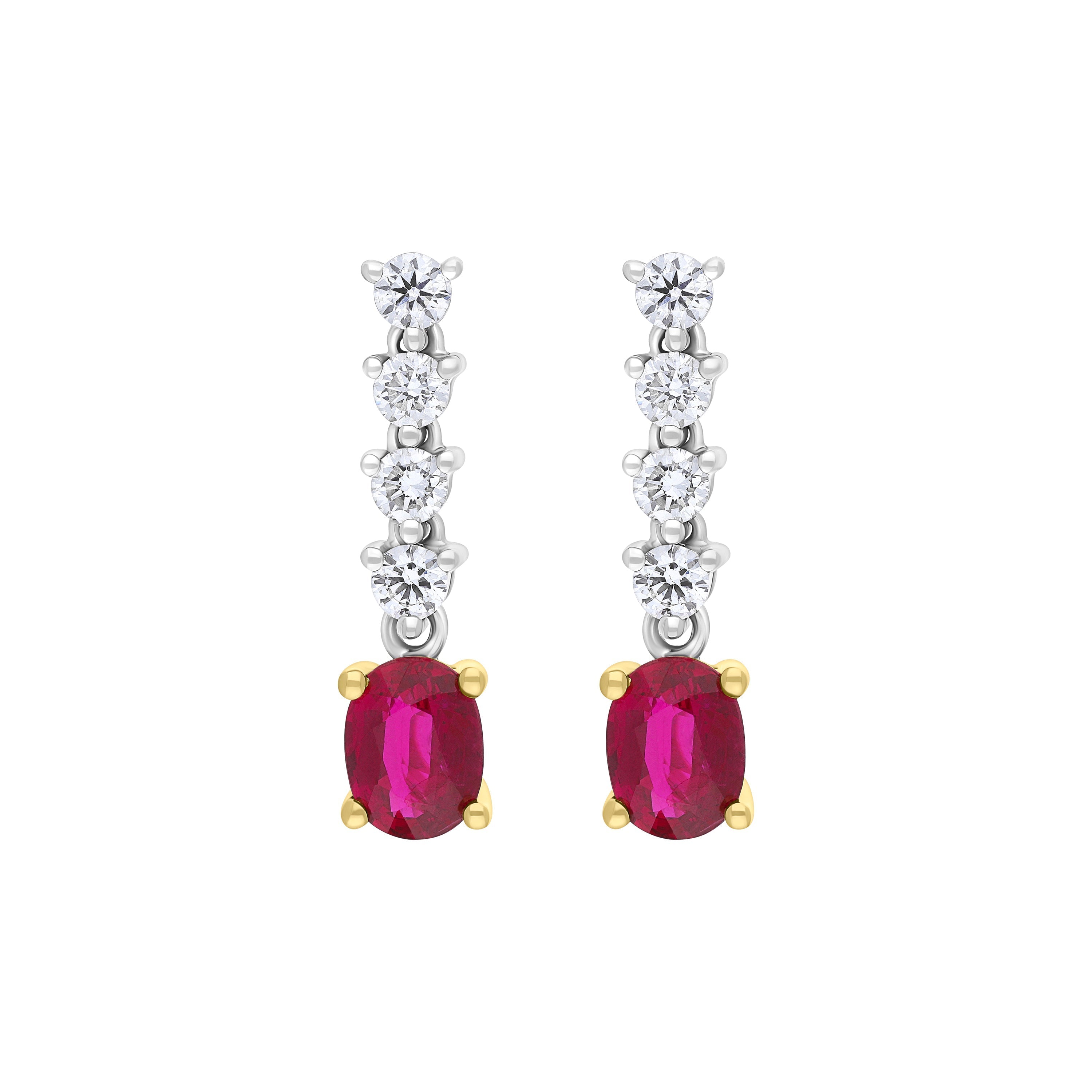 These beautiful 18ct white gold earrings features two stunning oval rubies with a total weight of 0.76cts set with yellow gold claws. The lovely drops are further embellished with brilliant cut, round white diamonds totalling 0.31cts. The earrings are completed with post and butterfly style fastenings.