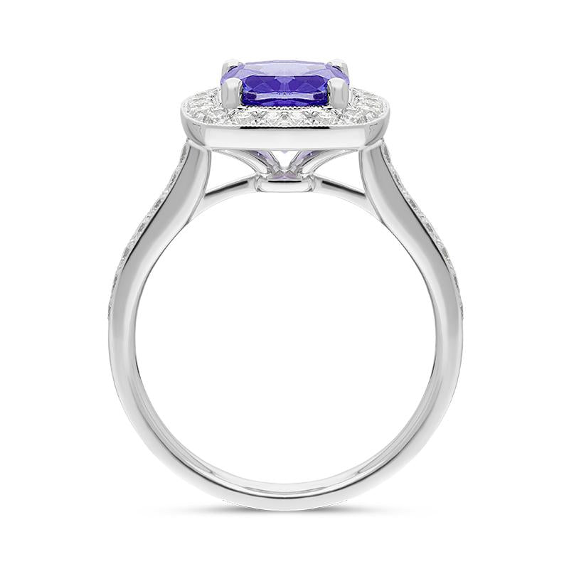 This strikingly elegant 18ct white gold ring showcases a cushion cut Tanzanite totalling 1.66 carats, discovered in the Mererani Hills of Northern Tanzania. The beautiful gemstone is framed with a 0.51 carat halo of brilliant cut diamonds. The breathtaking ring is an embodiment of elegance and luxury with Tanzanite being one of the world's most desired stones. This seductive gemstone can exhibit a variety of surreal colours including blues, violets and burgundies so each piece is truly unique and beautiful.
