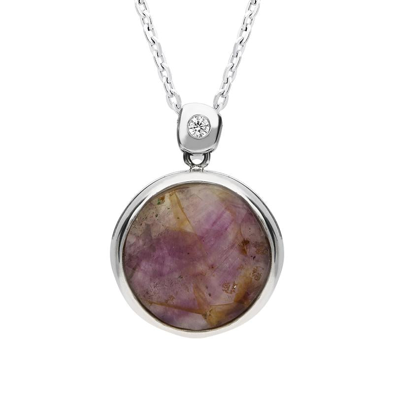 An elegant unique, faceted round shaped pendant of Derbyshire Blue John set in 18ct white gold. Just below the bale sits a single 0.05ct diamond adding extra sparkle and detail, and an 18ct white gold 18 inch chain completes the piece.