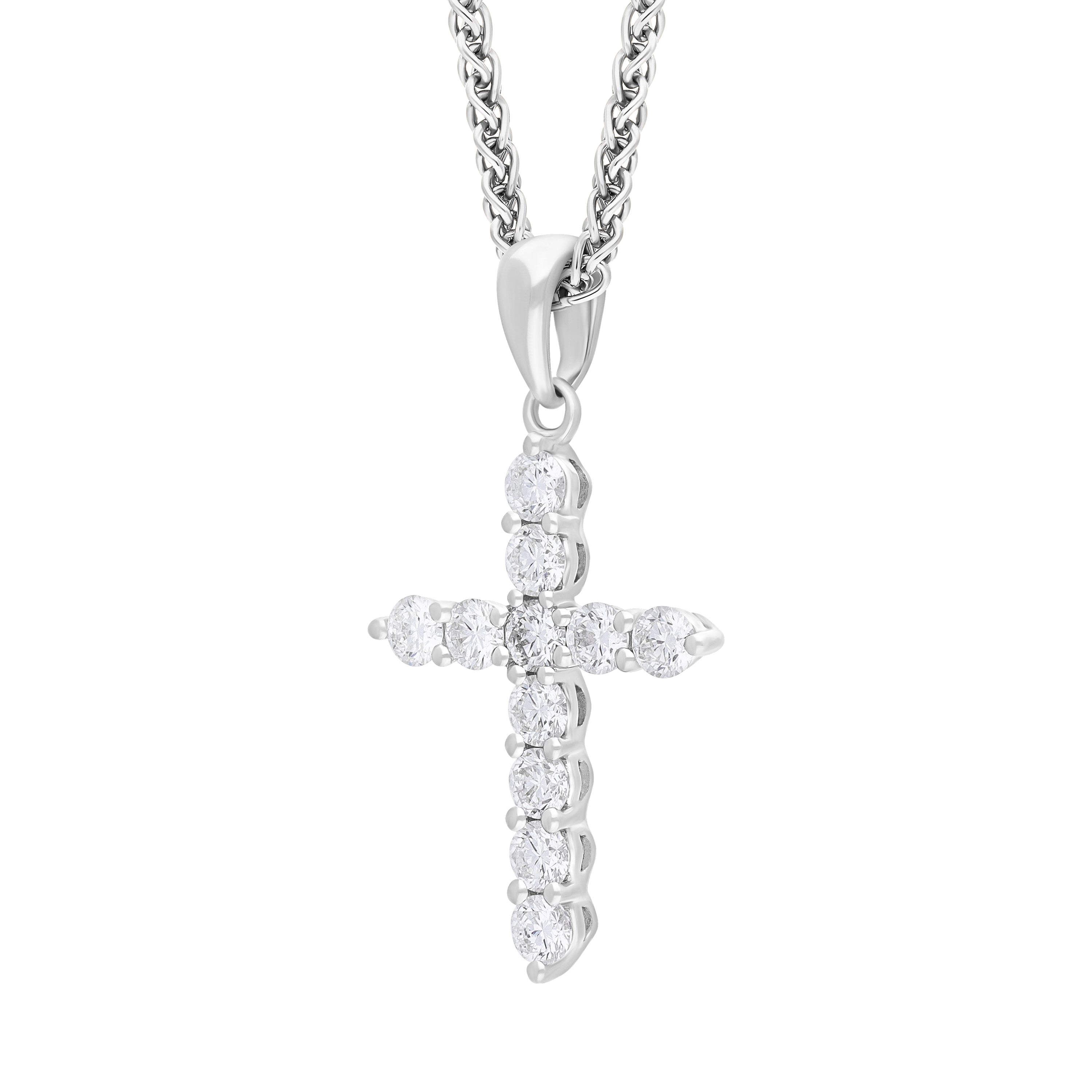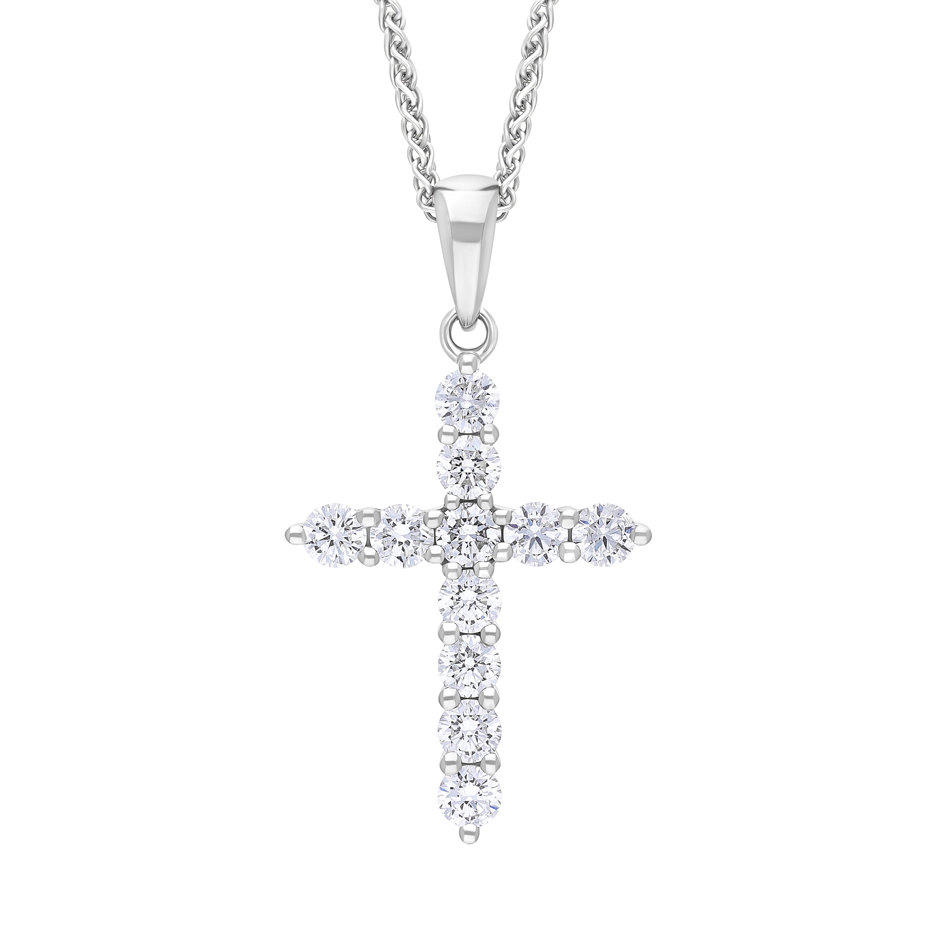 This elegant 18ct white gold pendant features eleven round brilliant cut diamonds (0.50ct total), arranged to create a stunning cross design. The pendant is presented on an 18 inch long 18ct white gold chain with a lobster clasp fastening.