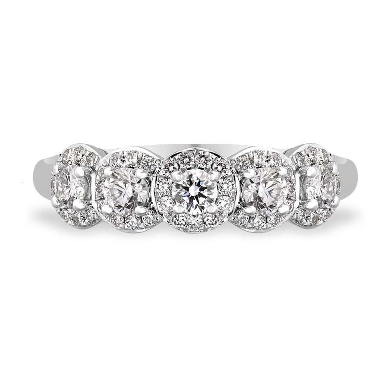This stunning 18ct white gold ring features five round brilliant cut diamonds, each surrounded by diamond halos (0.50ct total). The 18ct white gold band gives this beautiful ring a solid and substantial weight, making this a piece that will be treasured for generations to come.