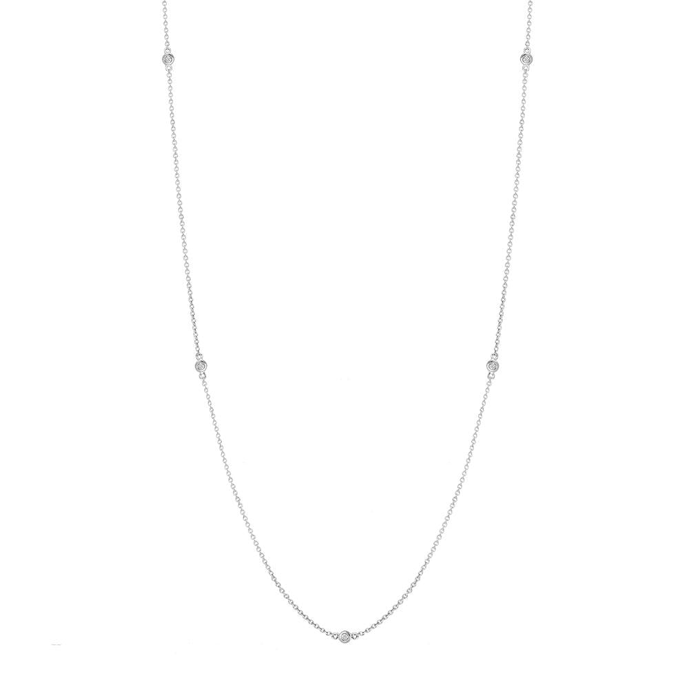 An embodiment of feminine style, this 18ct white gold 22 inch long fine necklet is set with 8 round diamonds totalling 0.08cts. Wear on its own or as the perfect layering piece.