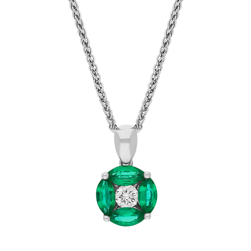 This classic petite 18ct white gold pendant features four marquise cut emeralds arranged in a circle (0.50ct total) around a single sparkling brilliant cut diamond (0.11ct total). The pendant is completed with an 18inch long 18ct white gold chain.