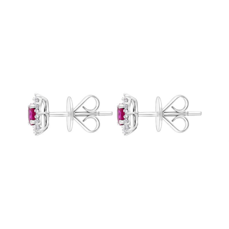 Feminine and elegant, these 18ct white gold stud earrings features round cut rubies (0.49ct total), surrounded by clusters of brilliant cut diamonds (0.13ct total). Designed perfectly for everyday wear, the earrings are completed with secure post and butterfly fasteners.