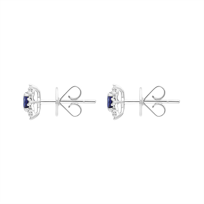 An embodiment of elegance and luxury, these luxurious 18ct white gold stud earrings feature central round cut sapphire gemstones, totalling 0.10ct for the pair. The deep blue gemstones are framed by 0.42ct of brilliant cut diamonds, adding an extra touch of luxury and sparkle. The stones are claw set in 18ct white gold and are completed by post and butterfly fastenings.