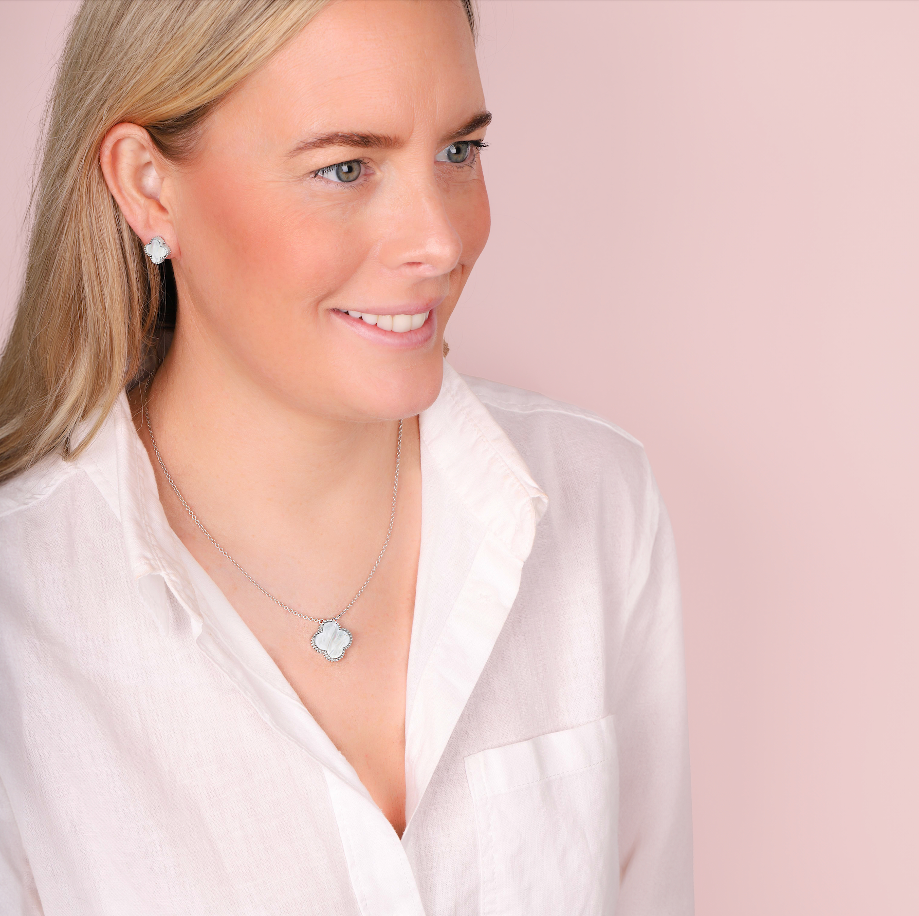These elegant earrings feature stunning four leaf clover shaped cabochons of the finest Mother of Pearl. The clovers are surrounded with a ball edge detail for a unique, stylish finish. The striking Mother of Pearl forms a stunning combination with the 18ct white gold, the perfect look for every occasion. Presented on post and butterfly fitments for secure wear.